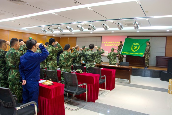隨后全體應(yīng)急隊員在領(lǐng)誓員帶領(lǐng)下面對隊旗莊嚴(yán)宣誓:“我志愿加入溫州市危險化學(xué)品安全生產(chǎn)應(yīng)急救援隊,忠于職責(zé),嚴(yán)明紀(jì)律,恪盡職守,刻苦訓(xùn)練,堅決做到服從命令、聽從指揮,發(fā)揚不畏險、勇?lián)?dāng)、講奉獻(xiàn)精神,為維護(hù)社會及公司安全貢獻(xiàn)自己的力量”的錚錚誓詞,鏗鏘有力,響徹會場,彰顯全體隊員的莊嚴(yán)承諾和堅定信心。金海公司總經(jīng)理、黨支部書記虞智勇對隊伍長期以來不畏艱險、沖鋒在前,不負(fù)重托、守護(hù)安全,不辱使命、傾情奉獻(xiàn)表示充分肯定和由衷感謝,并對全體隊員提出三點期望和要求:一是要提高站位,切實增強(qiáng)工作榮譽(yù)感和使命感;二是要增強(qiáng)本領(lǐng),不斷提高自我防護(hù)和應(yīng)急能力;三是要服務(wù)奉獻(xiàn),堅決守牢安全防線和安全底線。