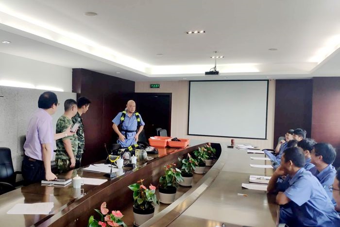 消防隊(duì)員結(jié)合該公司水處理工藝及流程,以輕型防化服與正壓式空氣呼吸器的正確組合穿戴為切入點(diǎn),為現(xiàn)場(chǎng)工作人員全面系統(tǒng)介紹消防應(yīng)急裝備的參數(shù)性能、操作使用及維保方法,并指導(dǎo)大家開展現(xiàn)場(chǎng)穿戴體驗(yàn)。通過模擬現(xiàn)場(chǎng)處置方式增強(qiáng)應(yīng)急救援臨場(chǎng)感,從而快速了解熟悉專業(yè)應(yīng)急救援知識(shí)并掌握正確穿戴和使用消防應(yīng)急裝備的能力。